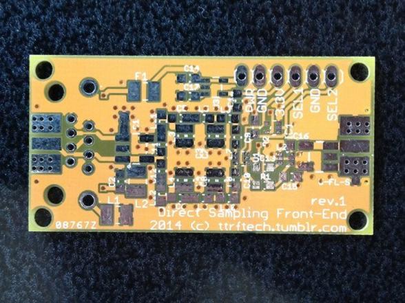 最初の黄色い基板はダイレクトサンプリングフロントエンドの改良版です。フィルタを5次にして切れを良くしたつもりです。ジャンパの差し間違いを防ぐためにピンヘッダを一列にしました。それから出力側にトランスを搭載できるようにパターンを追加しました。前回は穴の位置も失敗していたのも修正しました。