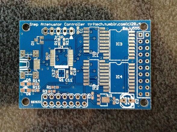青い基板はステップアッテネータのコントローラです。ご報告したようにPLLで信号源を作りましたが、レベルが強力すぎて信号源としては使いにくい場合があります。SMAの固定ATTで調整してはいるのですが、調整するのが面倒なのと絞りきれないこともあるのです。こんなときはステップアッテネータが欲しいところなのですが、なんと手元にあった謎のユニットがステップアッテネータでした。以前厚意で譲って頂いたもので、そのまま使わずに置いてあったのですが、今回解析してみると5dBステップで28段、-135dBを絞れるなかなかの高性能品でした。おそらくSGに使われていたものだと思われます。リレーが12個あり制御パターンが単純では無いので、これまで素性が謎だったのですが、今回の解析で判明しましたので、これを制御すべく回路を起こしました。ある程度の電流をリレーに流し込む必要があるので16bitのシンクドライバとし、MPUで制御するようにしました。汎用的なものなのでLEDなどの駆動にも使えると思います。