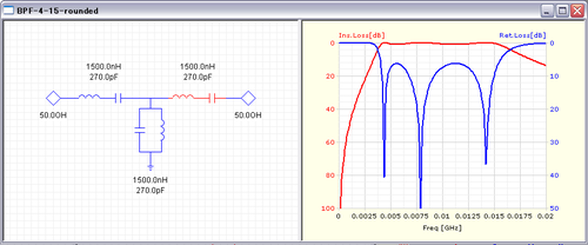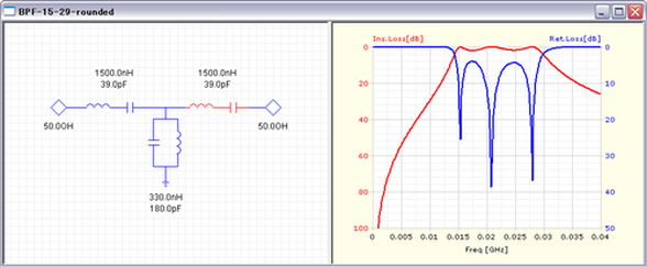 Ansoft Designer SVでシミュレーションした結果です。チップ部品として入手しやすく、部品の種類を増やさないようなるべく同一の定数になるよう検討してみました。