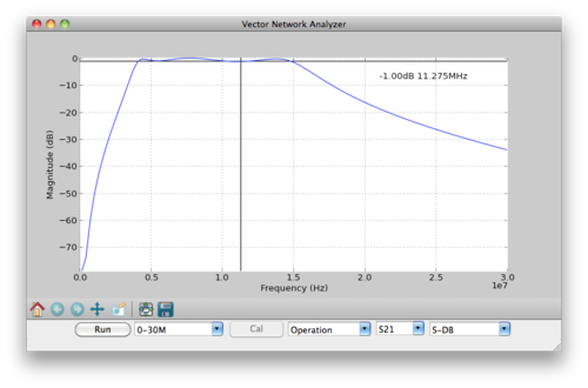 さて、これを実際にVNAで通過特性を取ってみました。まずは下側3-15MHzのBPFです。通過域やリプルの様子など、かなりシミュレーションと近い結果が得られました。ちなみにVNAのキャリブレーションは簡便にレスポンス校正のみでやっています。