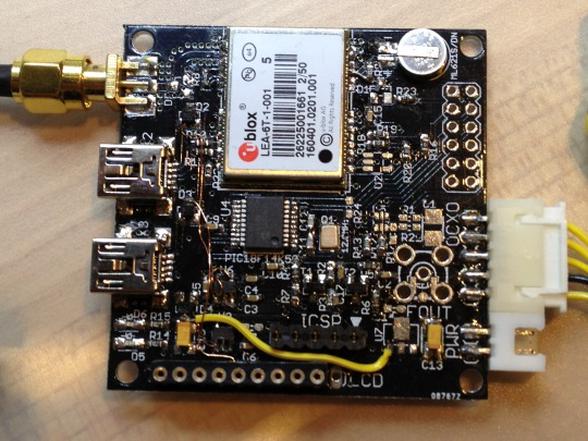 この基板にはGPSモジュール並びにPIC、二つのUSBコネクタがあります。どちらもCDCデバイスでPCからはシリアルインターフェースとして使うことができます。GPS側はNMEA 0183フォーマットでデータが出力されており、ubloxのツールu-centerを使うことで動作状況のモニタと各種設定を行うことができます。一方PIC側は、時刻と内部でカウントした値を独自に書き出しています。いずれもPCからはテキストで読み出すことができます。